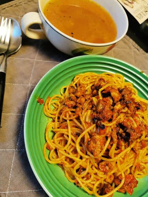 で、茄子2本分を可能な限り小さく切って、炒めたあとに、牛挽き肉と苦労してミンチにした豚肉を投入。からの、切ってあるトマト缶を投入。蓋が硬すぎて、菜箸で開けようとしたら折れるハプニング…涙。ここのタイミングでみらんくん用の取り分けをし、大人の分にはガーリックパウダー、コンソメ、黒胡椒、トリュフオイル、などを入れて水分飛ばす。