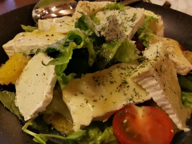 最初にチーズとオレンジのサラダ。チーズ絶品。ミニトマト🍅は全部みらんくんに食べられ、親2人には1つも回ってこず。。。