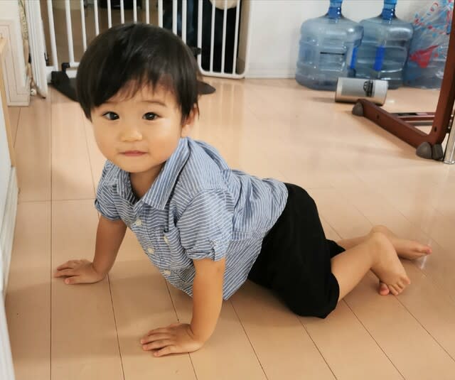 にちゃーい、って2歳になった時に、ピースサインが出来るように、パパと2人でお風呂で練習したりしているような状況とは真逆で、もう0歳児後半のような見事なハイハイ、、、なんでだ、、、君は歩けるどころか、走れるだろうに。
