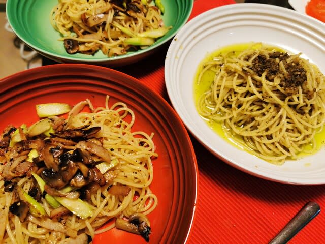 1つ目はベーコン、アスパラガス、マッシュルームのオリーブオイルのパスタ。ま、これは我が家の定番ですから何度も何度も作っています。しかし、今日からベビーパスタを使わなくなったので、みらんくんも全く同じ、de ceccoのパスタを食べることになりました。パックパク食べていたのが嬉しいですなぁ。