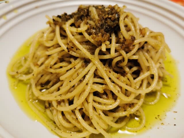 そして2つ目は、初めて、ジェノベーゼ。ま、これはぶっちゃけ出来合いのジェノベーゼソースを瓶で買ってきまして。みらんくんのを取り分けたあとは、大人用に、ガーリックパウダー、黒胡椒などを掛けて、更に敢えてフライパンで一度炒めて、2つのパスタの食感を変えてみた。ジェノベーゼソースが元々塩っぱかったのか、ちょっと辛かったけど、まぁ、これも悪くないかな。