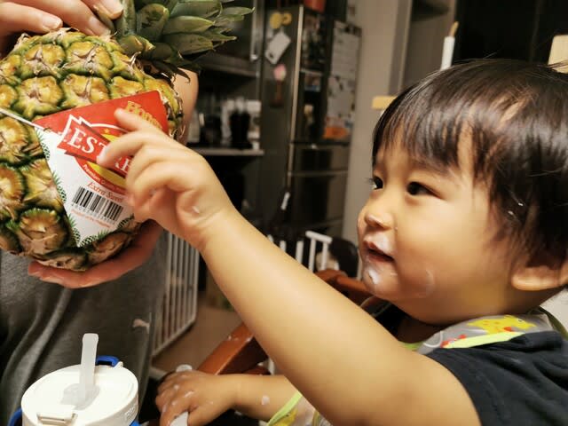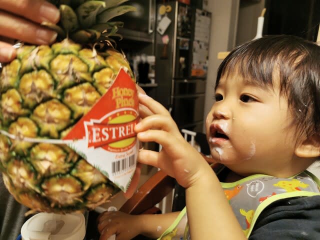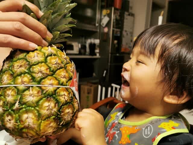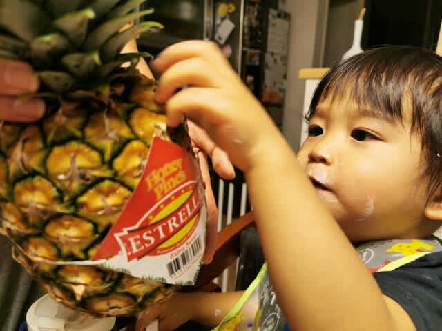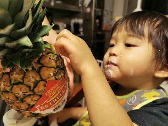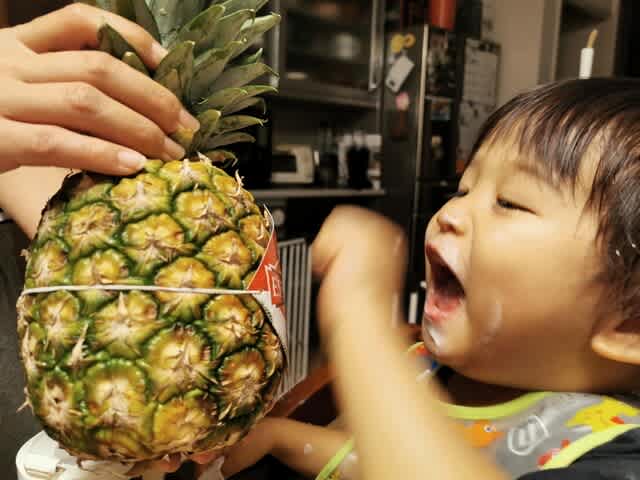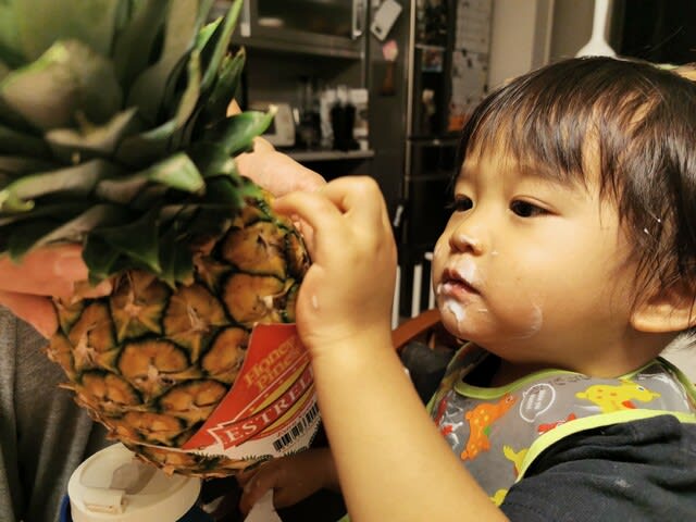 めっちゃ繊維質のパイナップルで歯に挟まりまくりのようで、ママに糸ようじで取ってもらってましたな。