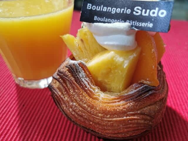 昨日Boulangerie Sudoで買ったパイナップルとマンゴーのタルトね。