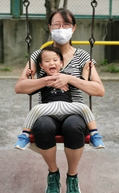 ママのお膝の上で乗れて良かったねぇ。