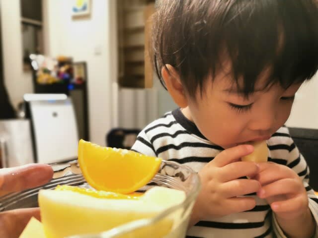 『食後にフルーツ、モグモグモグ···』
