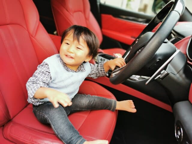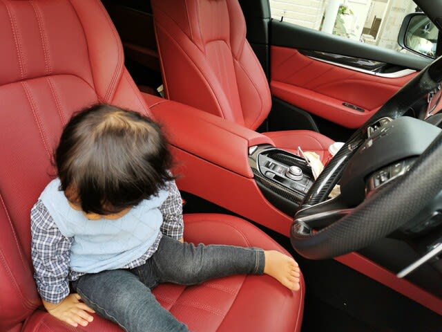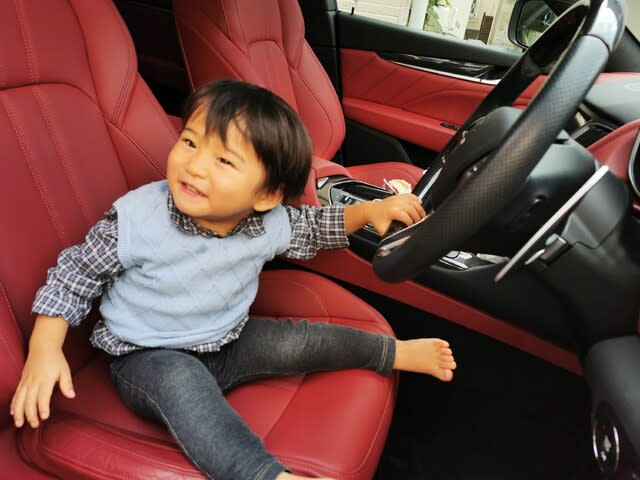 車、電車、飛行機などを好きになるのは男の子って言うのは昔ながらのステレオタイプなんだろうけど、しっかりこの人は車のこと好きですね。ドライバーズシートに乗せると物凄く楽しそうな顔をする。