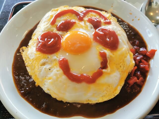 ハンバーグはお気に召さずでオーダーしようと思ったのにせず、結果論、アンパンマンのオムライスに。可愛くても食べちゃうんだよねぇw。何度も確認しましたよ、崩すよ、とね。やっぱり昔ながらのチキンライスに卵が掛かり、その周りにカレーが掛かっていた。