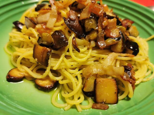 夕方に起きてから、改めてお風呂に入り、そして夕飯を作る。今日は白ご飯がなかったし、パスタを作ることに。今日は、ベーコン、ナス、椎茸をオリーブオイルとコンソメで炒めて。大人用はガーリックパウダーを入れて、更に黒胡椒で味を。