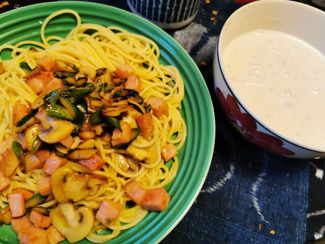 作る言っても、大したことない。アスパラガス切って、マッシュルーム切って、ベーコン🥓切ってフライパンで炒めてからのコンソメ、トリュフオイル、で整えて。あとはde ceccoをal denteで湯掻いたら混ぜる。からの炒める。ここがポイント。ほんの少し炒めると乾麺が生パスタっぽくなるのよね。モチっとね。でも炒めすぎるとフライパンに引っ付くし美味しくなくなる。