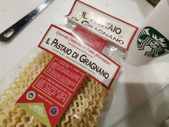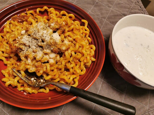そのソースとFusilliをあわせたんだが、完全に量を間違えて4人分くらい湯掻いてしまっていたね。Fusilliって分量がマジで分からなくてね。この袋に500g入っていたそうなので、いつものDe Ceccoのパックと同じなんだとあとから気付いた。De Ceccoのパスタだと家族3人で半分弱くらいかな。ちょっとお腹減っている時は半分の250gくらい湯掻く。けど、もっと量が少ないのかと思って、6割から7割弱の量を入れてしまって。。。と言うことでこれは味変掛けて、明日のおいらのお昼ごはんとなりますw。