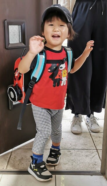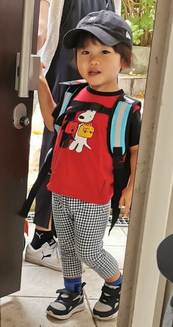 保育園に行く格好と同じようなリュック背負って。