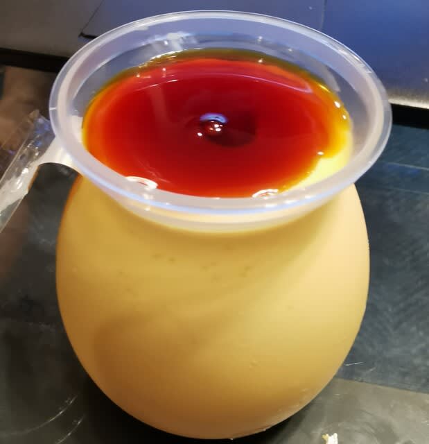 Best before endがまさにこの日だったので、プリンを食べてしまわなければと言うことで食後に食べようとしたんだが、リビングまで持ってきたのは我が家の王子。
