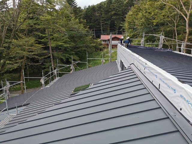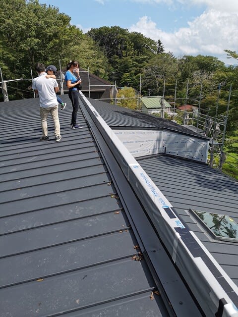まだね、足場があるので屋根に。そのうち登れなくなるんで今のうち。高いとこ嫌なんだけどね。
