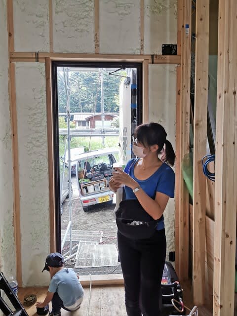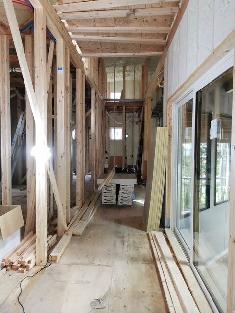 外リビングに出るところにガラス窓取り付けられていた。行く度に進みの速さにビックリする。