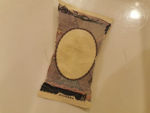 いつも歩いている歩道に、何か見慣れたような意味不明のものが。よく見ると1000円札の切れ端。誰よ、破るのは。。。意味分からんわ。こう言うのって、法律的に禁止されてるんだけどね。ま、お札破るようなバカもんは知らんのだろうね…。