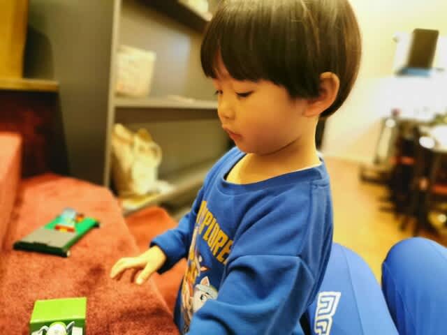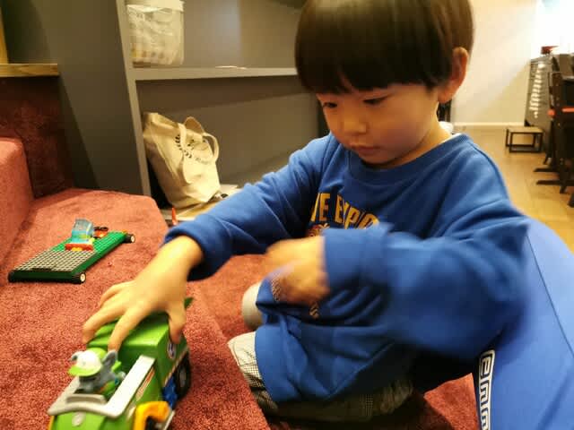 横浜のMARKISでおじいちゃん、おばあちゃんに買ってもらったパウパトロールのロッキーのおもちゃで早速遊ぶみらんくん。