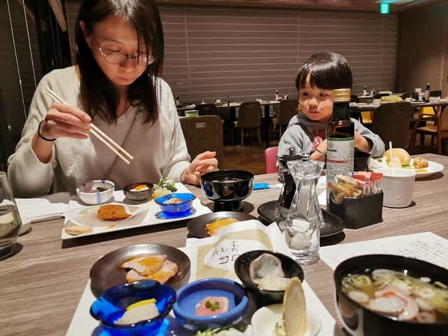 おいらは疲れたので部屋で温泉♨️入ったりゆったり。奥さんとみらんくんはお隣のラフォーレとかに探検。そしてゆったりと過し、予約したマリオット内のレストラン🍴へ。何回も泊まりに来てて初めて夕飯をコースにしたね。ビュッフェスタイルと一品運ばれるコースでしたね。