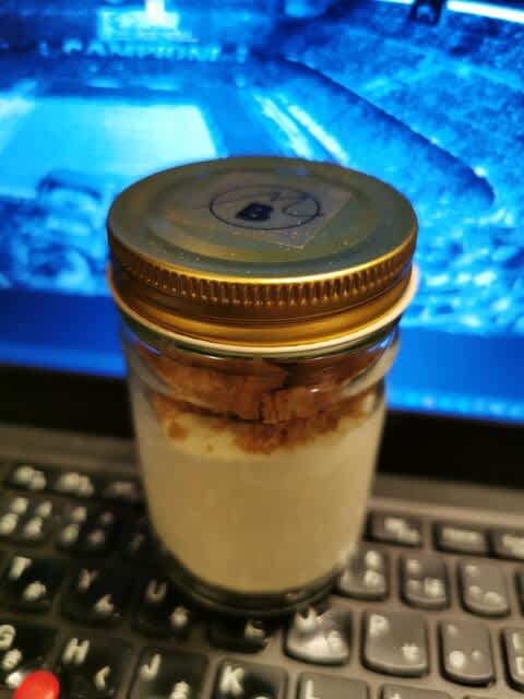 一番上の写真の横からの絵姿を見ればわかるけど、瓶の蓋の近くにはサクサクの塩味が少し効いたクッキーがありまして。これがレアチと混ざると美味しいのよぉ。。。