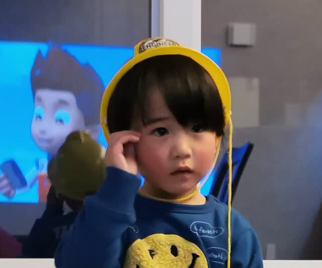 夕飯前に大人しくパウパトロール🐕🐶見ている時にも被りっぱなし。。。何被っても可愛いなぁ、おい♥
