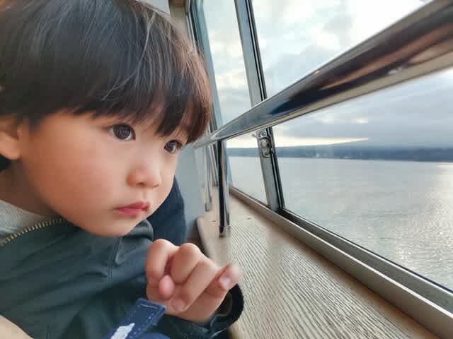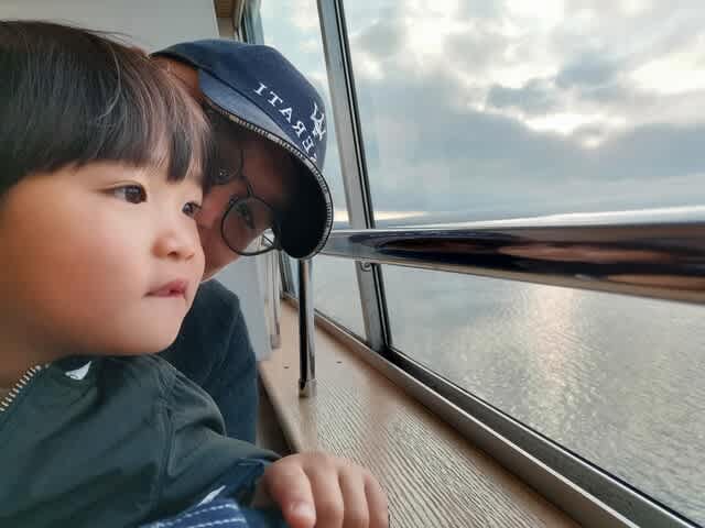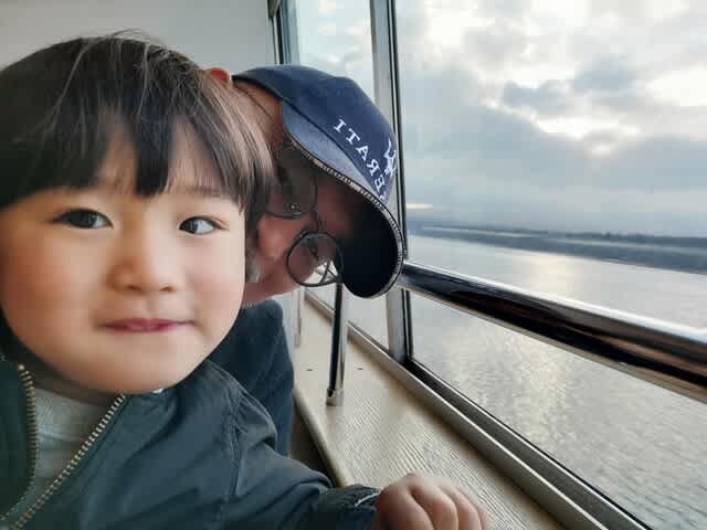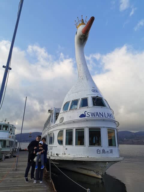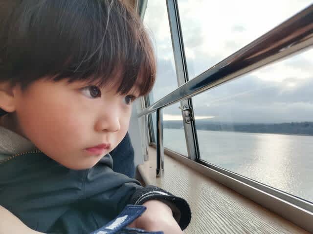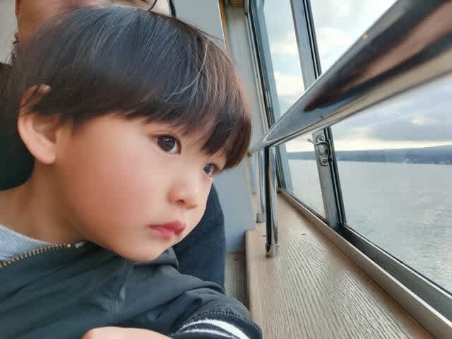 理由は寒い上に、モーターボートが縦横無尽に走っていて、その波🌊の影響を受けて、スワンボートが物凄く揺れていたから。そこかしこから悲鳴が上がっていたが、あの異様な揺れの上にみらんくんが騒ぐなんてなったら偉いことになると思って、止めようと説得した。でも船乗りたいーって言うから、じゃ、山中湖に移動して遊覧船に乗ろうと。ただ、最終便は16時半。河口湖から138号線が結構渋滞してて、山中湖の旭ヶ丘の船着場に着いたのは16時24分。そこから奥さんが走ってチケット🎟を買って、無事乗船🚢。