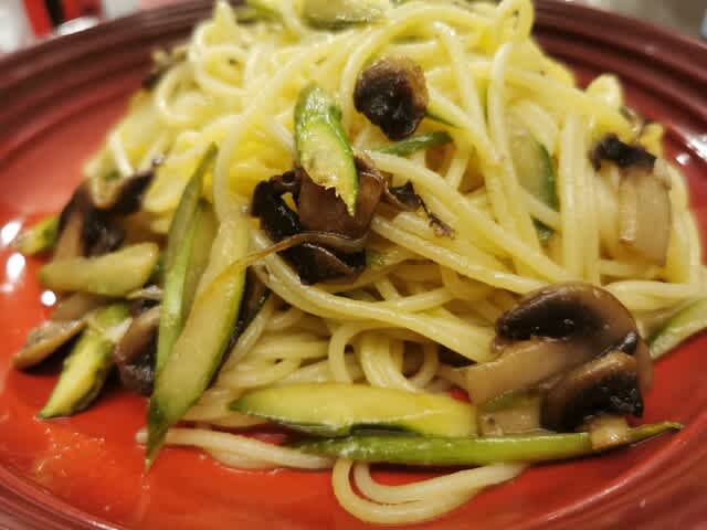 一方で、おいらはパスタ。アスパラガスとマッシュルームをガーリックパウダーとかで炒めて。ちょっとコンソメを入れすぎたかも。。。