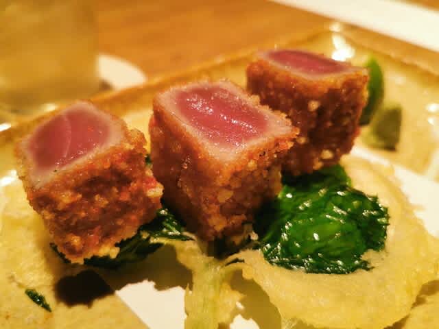 東京在住なのに、大阪の人に美味しいお店を教えていただくと言うね…w。いや、美味しいところが知られて良かったです。連れて行って頂いたのは、渋谷の雷庵と言うお店。TYの系列のようですね。締めで蕎麦を食べるのですが、それまでもかなりの分量が出てきましたね。それもその筈で、最もお値段の張るコースでした。色々と出していただいたものの中でも、この本鮪の五色揚げ 葉山葵と言うメニューの揚げ物がとっても美味しかったですねぇ。