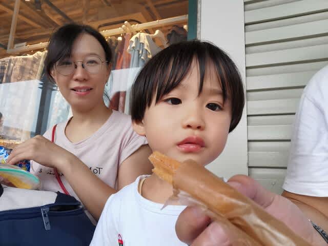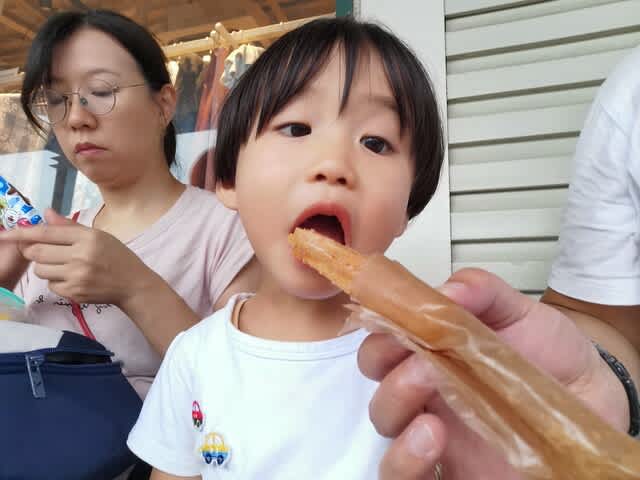 同時にチュロスを買いましてね。これはみらんくん🧸たっての願い🌟🙏。これ、あぶらとり紙みたいなのに包まれてましたが、油が滴ると言うね。言えよ、それ!って感じ。みらんくんのパンツめっちゃ油まみれに。。。