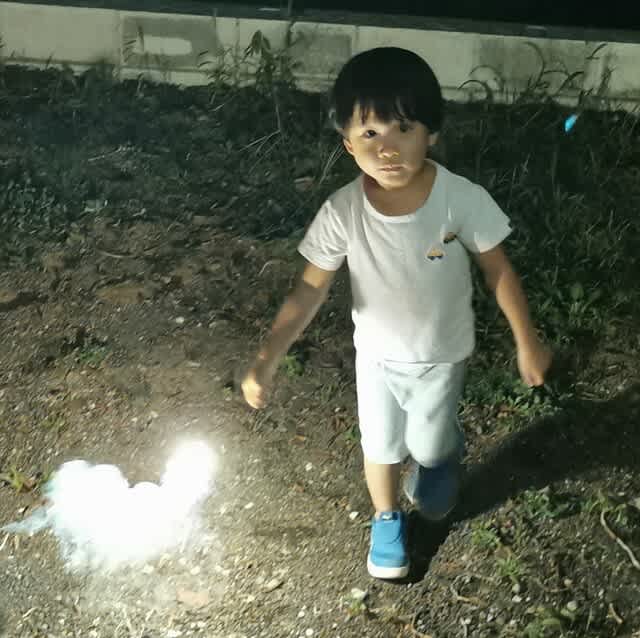 最後はやっぱり線香花火だよねぇ。みんなでやったんだけど、ママが持ったものが火花を散らしているところをみて、みらんくんがパチパチと。可愛すぎる…。