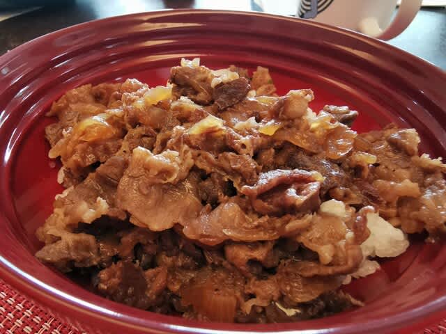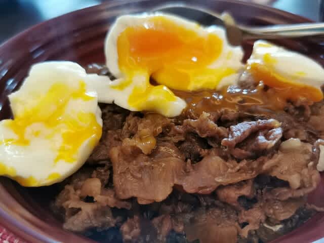 少し、半熟卵🥚は硬めになってしまったが、牛丼の味はバッチリ。醤油、砂糖、ガーリックパウダーを混ぜて味付け。