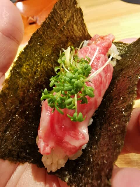 ホントの締めとしては蕎麦を食べましたが、それの前に、手巻き寿司をね。肉寿司ですわ。