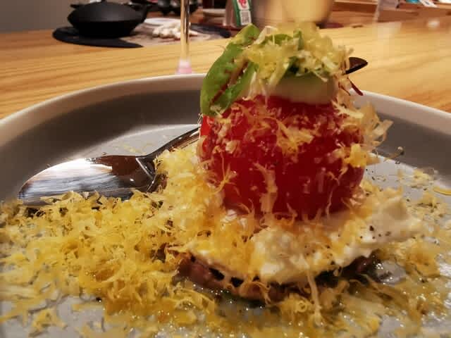 自家製のMozzarella。Burrataを自分で作っているんですと。これ、イチボのたたきの上に、Burrataを細かく切ったものを敷き詰めて、その上にトマト🍅、からのミモレットを削り。いやもう、Burrataの濃厚な感覚が口の中で広がり、あとからファサーっとミモレットがトマトと共に覆いかぶさるような感覚でしたね。またこのイチボのたたきが主張し過ぎず、これまた濃厚なんだけれども、バッチリと2種類のチーズ🧀にマッチしているのよねぇ。美味いしかなかった。