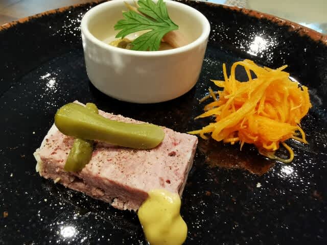 最初に突き出しとして、パテドカンパーニュなどが。相変わらずこの人参とかが美味しくて。見た目人参なんですが、オレンジの香りと味がふわぁーっと広がって、もう絶品で、みらんくん🧸もパクパク食べてましたな。