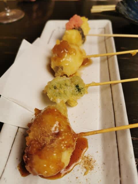 あとは串物。ごぼうで巻いた穴子が良かったですわ(一番手前)。