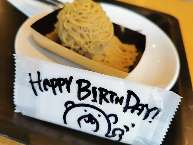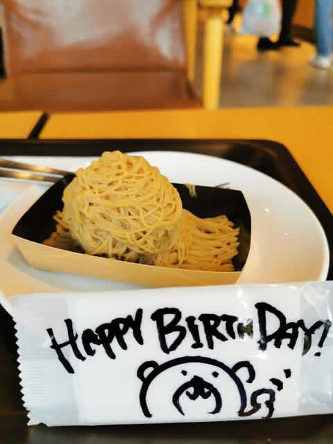 みらんくん🧸があれだけランチ食べたのに🍜、お腹空いたとか言うのでモンブラン🌰を。2ヶ月以上前なのに、レジのお姉さんに誕生日🎂とか言うからメッセージくれてw。