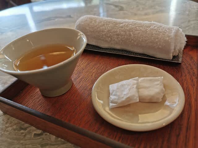 さて、チェックインの時からお庭に面したロビーで、手続き。お干菓子と共にお茶🍵も。