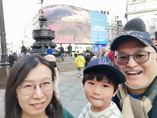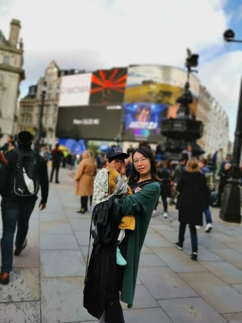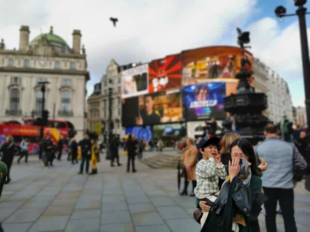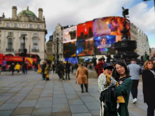 奥さんがみらんくんを抱っこして、Piccadilly Circus。。。感慨深い以外の何ものでもない。