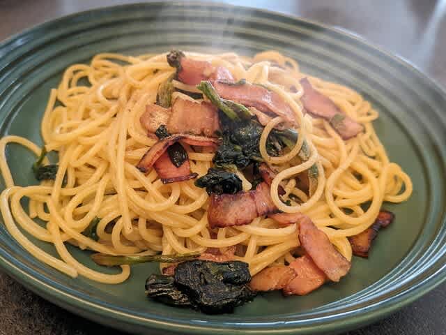 とてもじゃないが出掛けられないレベル🤣。と言うことで大人しく須走🗻のセカンドハウス🏠でお昼ご飯🍴。みらんくん🧸のリクエストでpasta🍝。昨日の夜🌃が到着が遅く、食材調達が出来ませんでね。。。あり物でpasta。結果、ベーコン🥓とほうれん草のオイルパスタ。隠し味はローストビーフ用のタレ。オイルパスタに少しだけ入れるのがポイント。