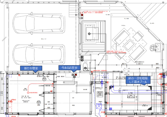 実際にスタッフとのMTGで使用している。しかし、泊まってもらうにはあまりにも脆弱なと言うか、そういうことは実際不可能なので日帰りしてもらいましてね。家族や友達であれば泊まってもらうのも良いが、スタッフや仕事仲間に泊まってもらうには、ちょっとね、と。なので、泊まれる場所を増築。そして泊まってもらった以上は楽しんでもらうとか、したいなと思って、プール。