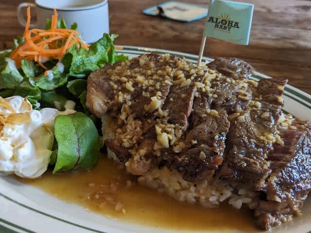でも、よく考えると値段が優しくなりw。このガーリックステーキ、1,800円。よくよく考えると、お昼の値段としてはめっちゃ高いと感じます。やっぱりランチは1,000円と言うのが既定路線かなぁって思うんだよなぁ。デフレ的な考え方に縛られている感じはあるが、やっぱりお高いもの食べよって、、、ってなるよね、1,800円もすると。