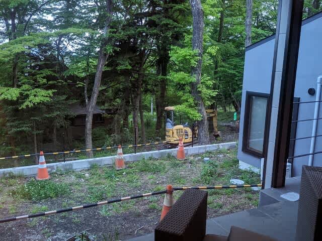 そのあと、いつから何が始まるのか、とか特に話がないままでした。が、朝起きたら、お庭に業者さんがいらっしゃいまして…。ちょっとびっくりw。既に重機が持ち込まれていたりしました。