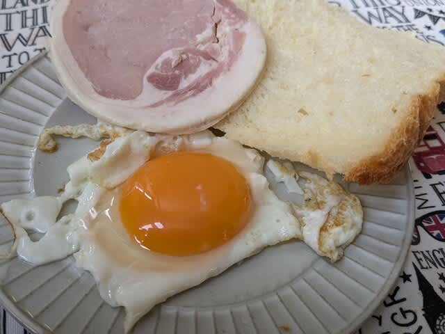 奥さんが焼いた食パン🍞を斬りまして、そこに目玉焼き🍳とハムを。最低限何かしらを胃の中に入れておかないと、この飲んでいる薬は胃が荒れるとのことでしたので。今日は時速3kmくらいでは歩けるようになってきたかなと思います。