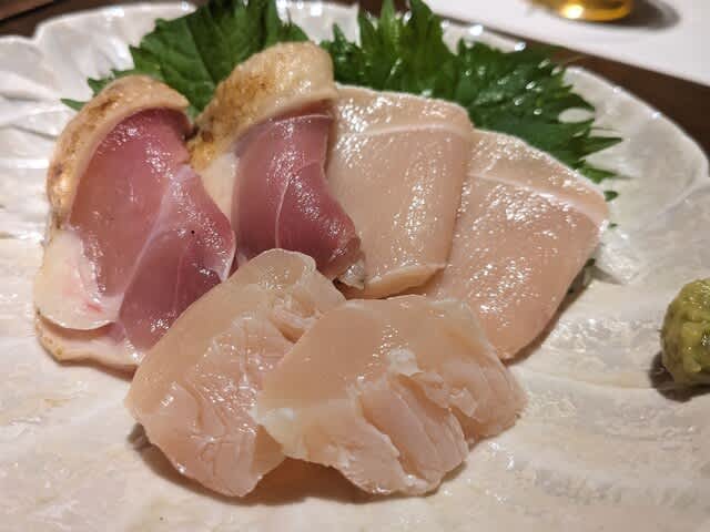 最初に、こんな鳥刺しが出てきましたね。もも肉を九州の濃いめのお醤油をちょっと付けて頂いたりね。大人です、完全に。