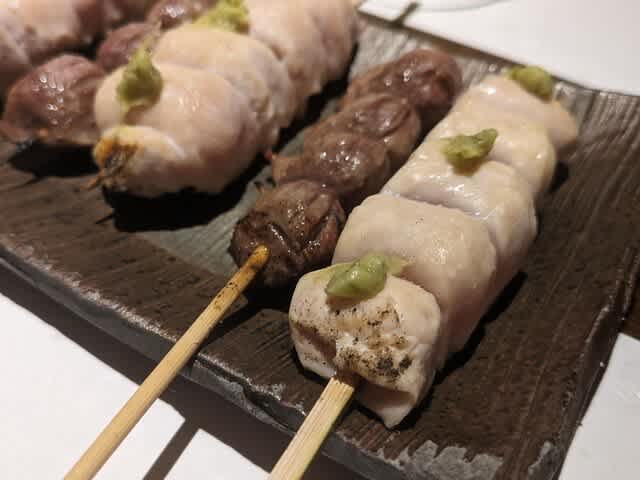 何種類かあったうちのいくつかの串。この砂肝には山椒。良い香りと脂の甘さと。ササミは一味と食べたりね。大人です、完全に。