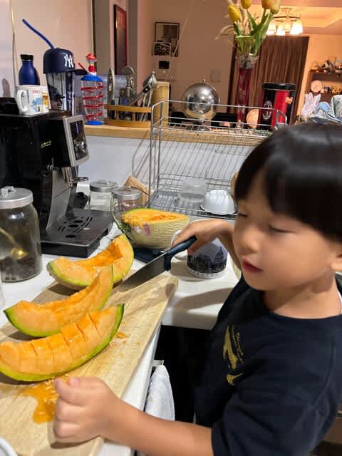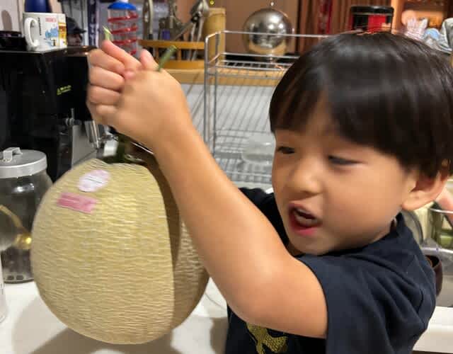 みらんくん🧸がママといっしょに切ってくれまして。少なくとも、みらんくんの頭と同じくらいの大きさではある。相当大きい🍈です。