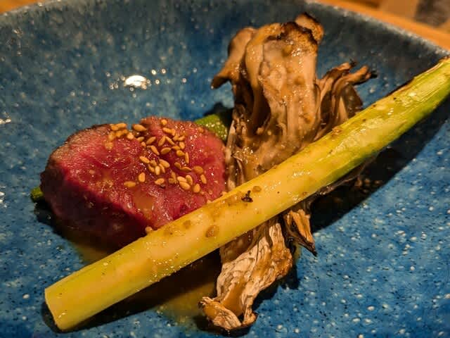 最初から最後まで堪能してきました。その中で気付いたことがちょっとあって。おいら、あまりあれが食べたいこれが食べたいとリクエストをするのは避けているんですね。いくら、ご亭主と長年の付き合いで、変に多少わがままを言っても、なんて思うのは、筋違いかと思っているし、その時に一番美味しいものを出してもらうのが楽しみなので。ある意味、定番的に出してくれているものもあると思っています。変えないものとして。ですが、この上の写真にある、アスパラガスなんかと一緒に出してもらったこのお皿なんかは季節によって変わるもの、と言う捉え方をしていて。この、舞茸だったかな、これなんかはこのお肉と共にいただくのがとてもとても美味しゅうございました。