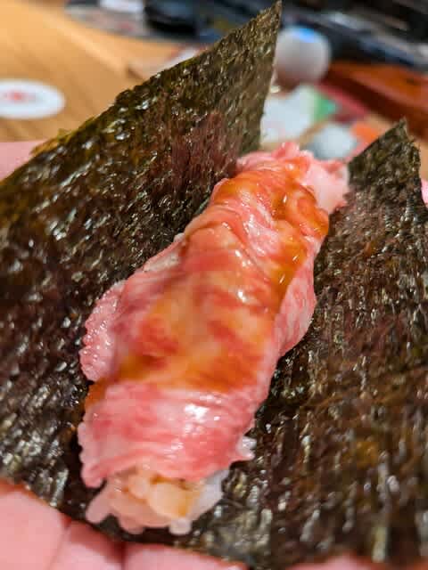 一方で、締めの方に入ってくると、昨日の中で使われた牛カツなんかは変わらないもの、なのかも知れません。そして、この肉寿司ね。これも変わらないもの、なんだと思います。