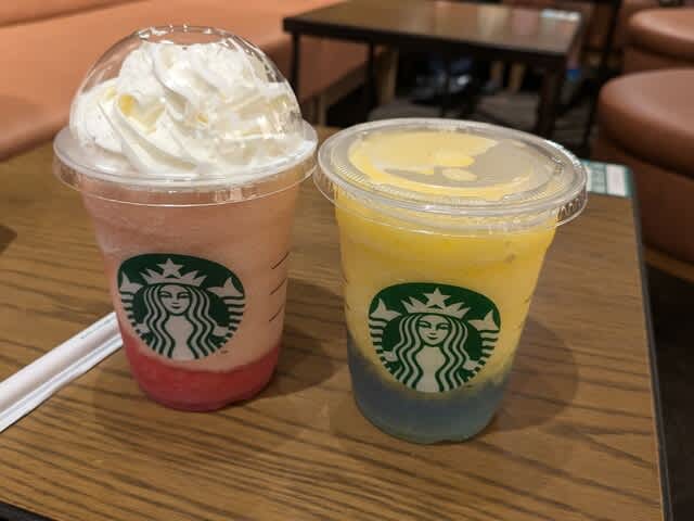 みらんくん🧸の要望を叶えるだけと言うよりも、おいらも寧ろそうしようと思っていたので、奥さんと合流してPeach Frappucino🍑の提供最終日に、先行で発売されたPineapple🍍Frappucinoを同時に飲むことに。