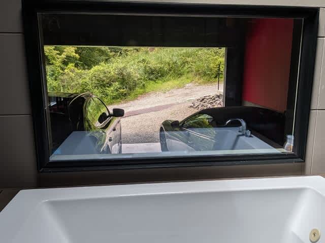 普段、シャッター閉めているから真っ暗なんですよね。もちろん、人感センサー付きライトとかはありますけれど。でもね、シャッター開けた風景をジャクージから見るってこんなんだったんだ!って気付いたの。何故ならシャッター開いているから明るくて、車も見えるし、外の緑も見えるし。いやぁ、これはね、ちょっと2年近く住んでて気付きませんでした。そしてこういう車観ながらジャクージって言うのが贅沢なんだなって改めて思ったな。