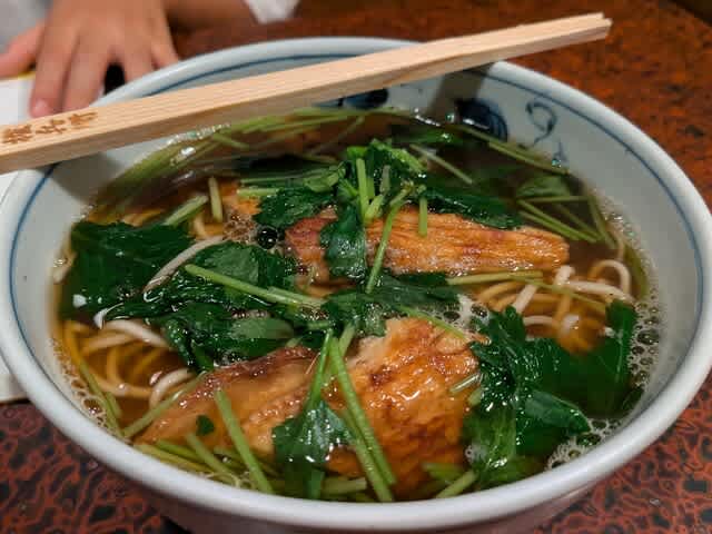 今日はみらんくん🧸が穴子蕎麦を。初めて食べましたが、香ばしくておいらの鳥なんばとはお出汁の味すら異なる感じ。実に美味しい。