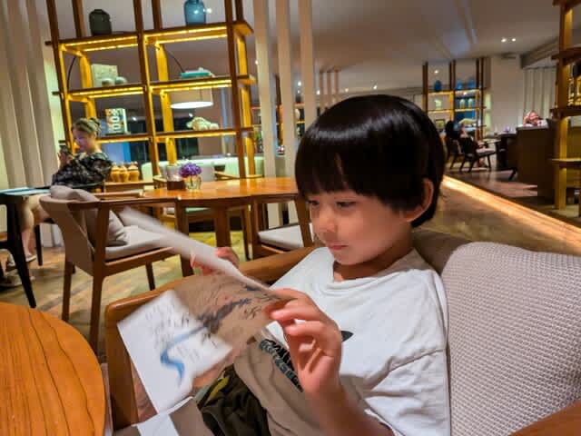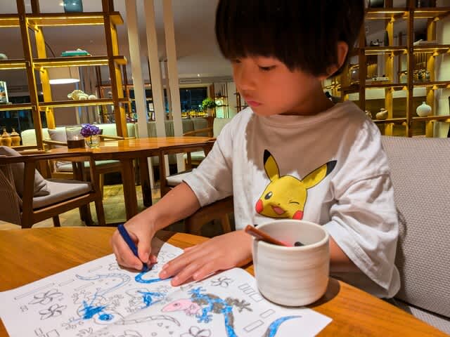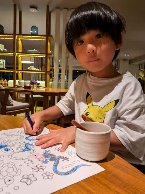 なのでホテル🏨内で夕飯🍽に。みらんくん🧸も大人しくお絵描きしてくれてるし。